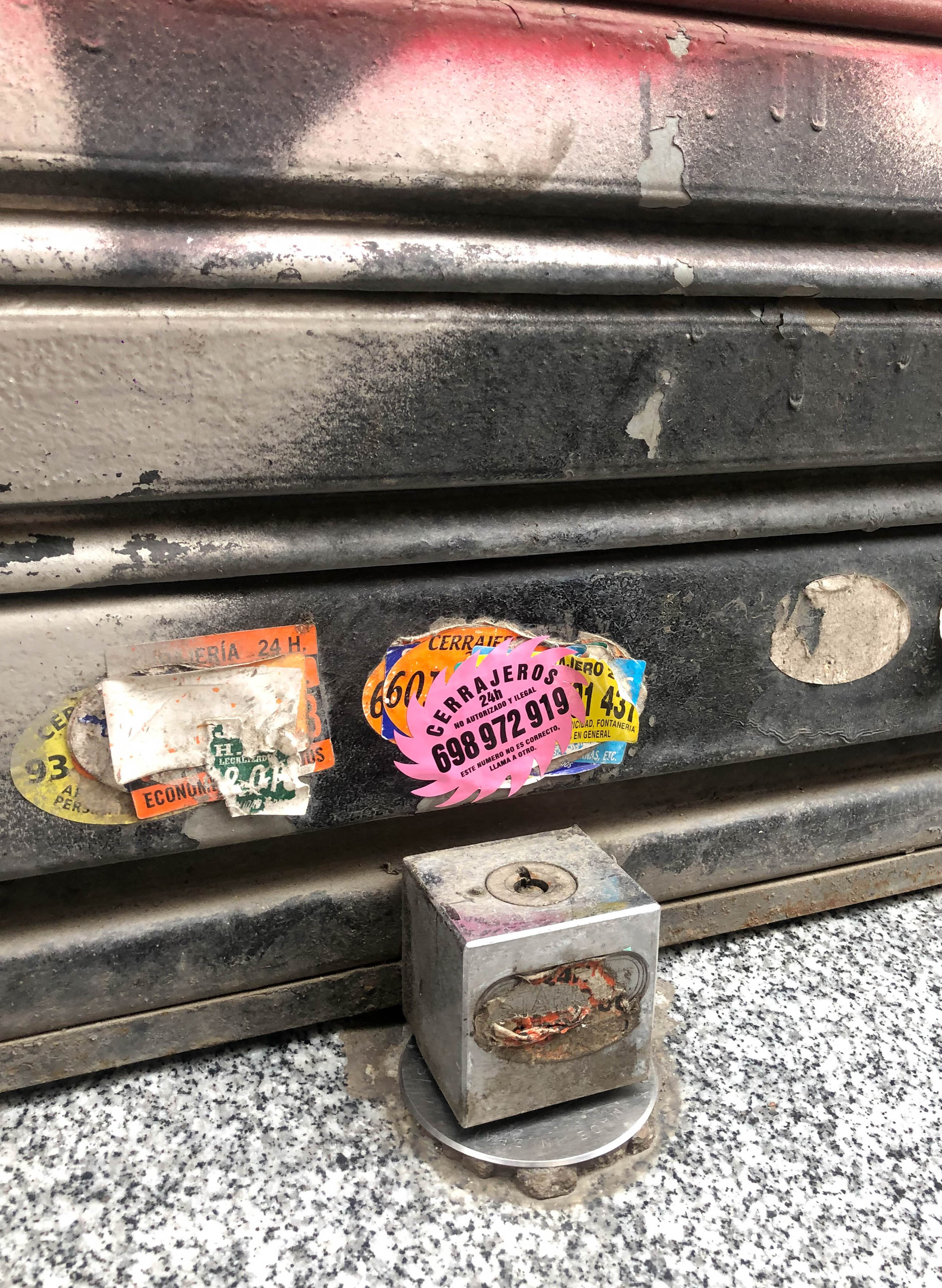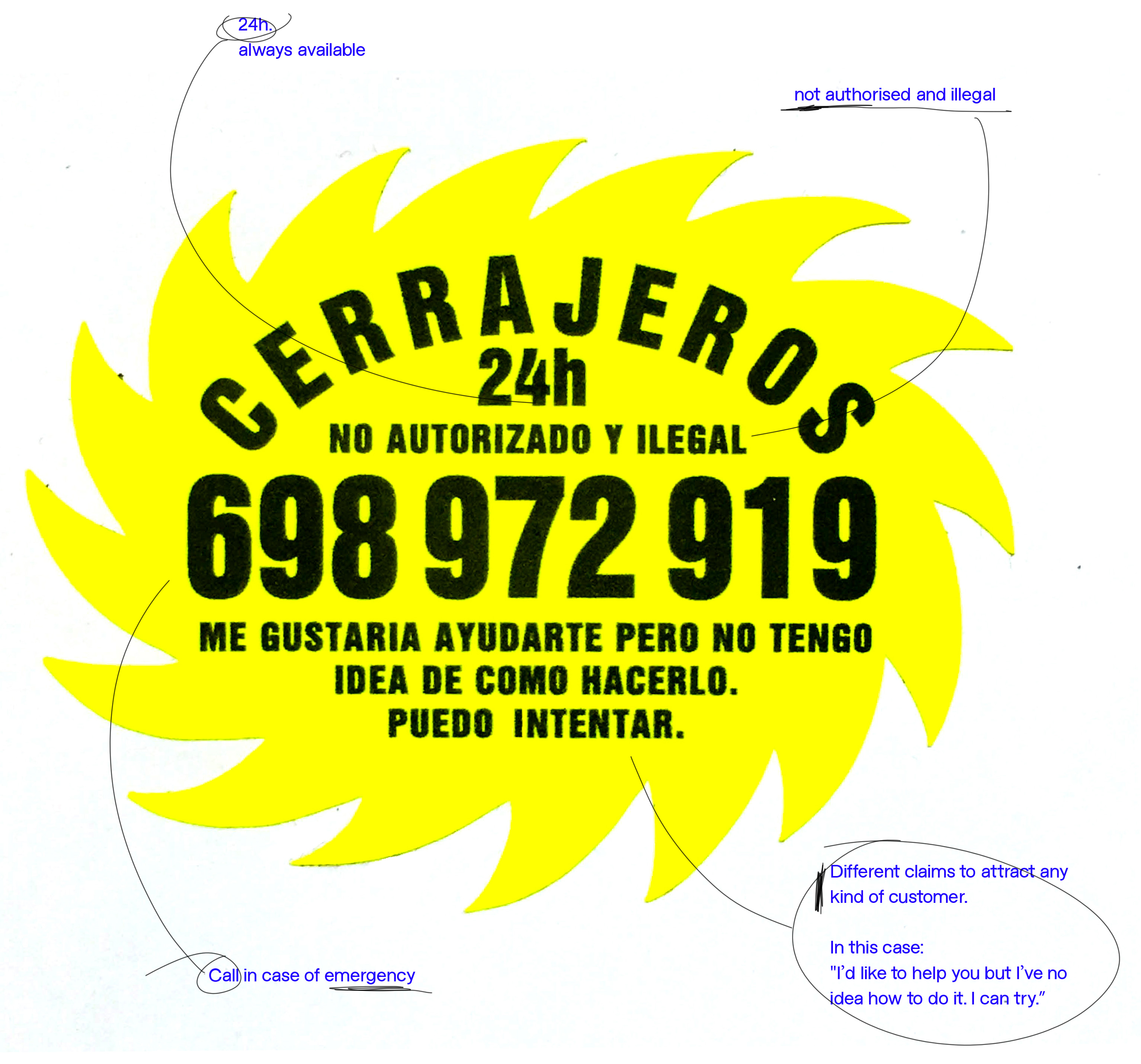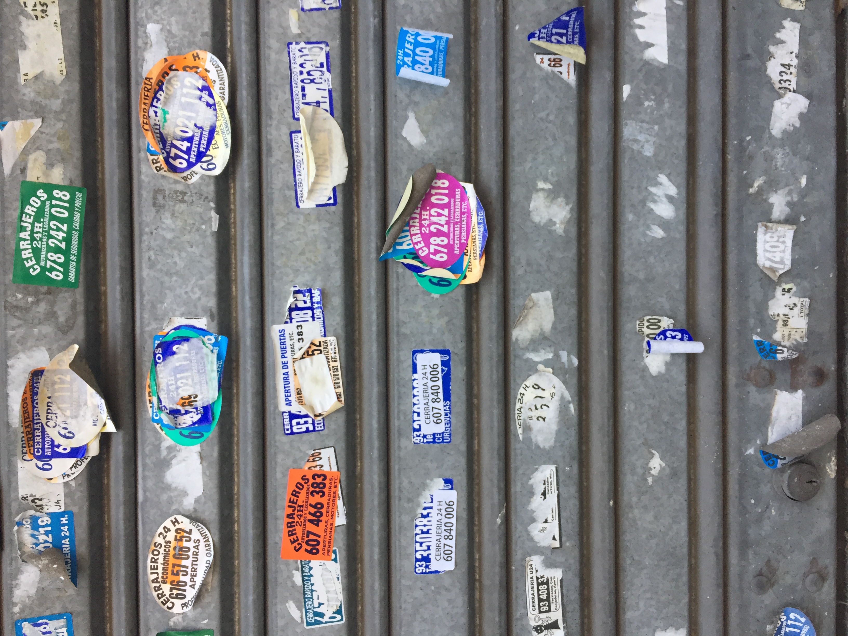 We can observe how the same sticker appears several times within a single composition, symbolizing a repeated guerrilla action between cerrajeros from the same neighbourhood (barrio).