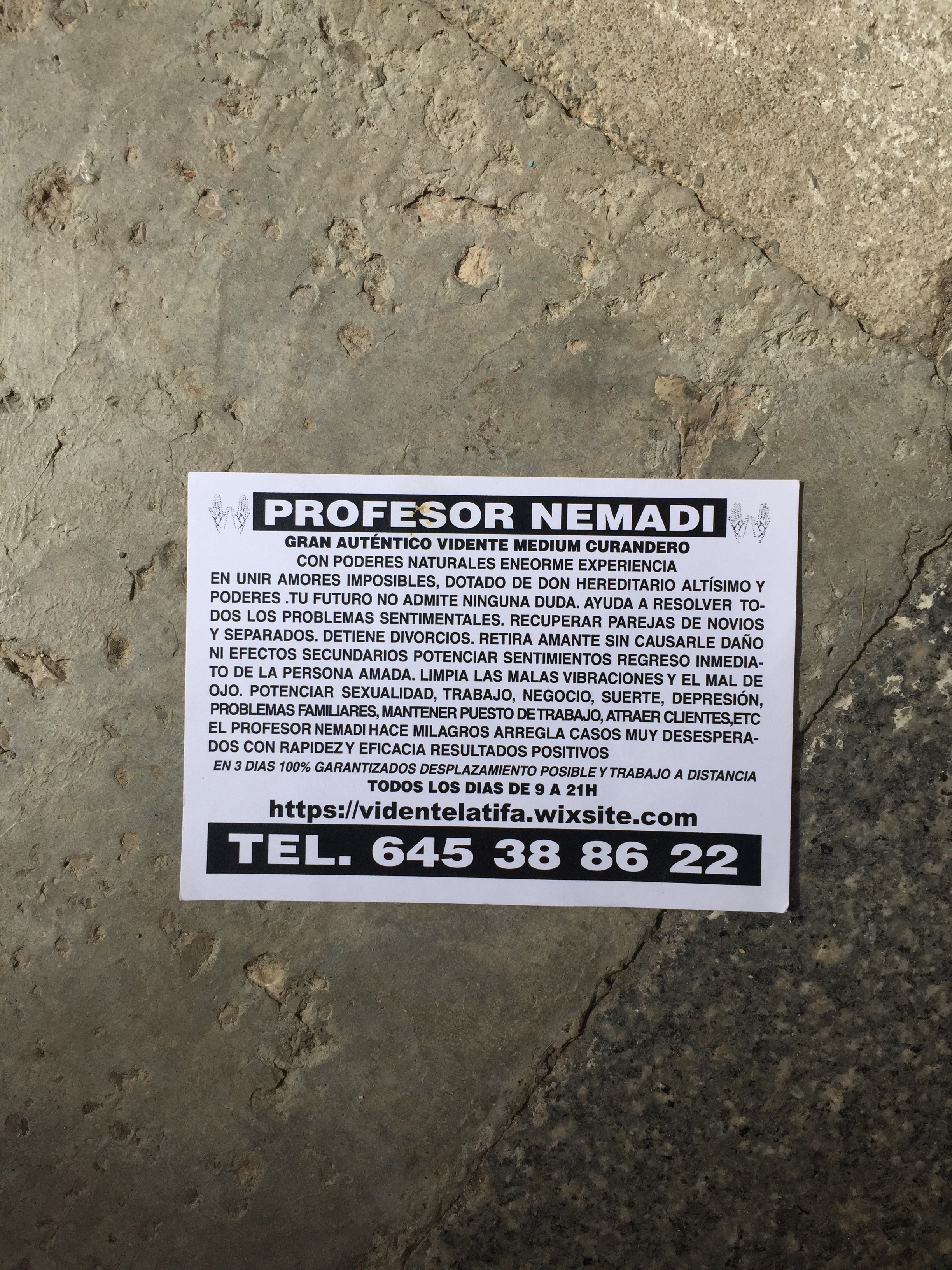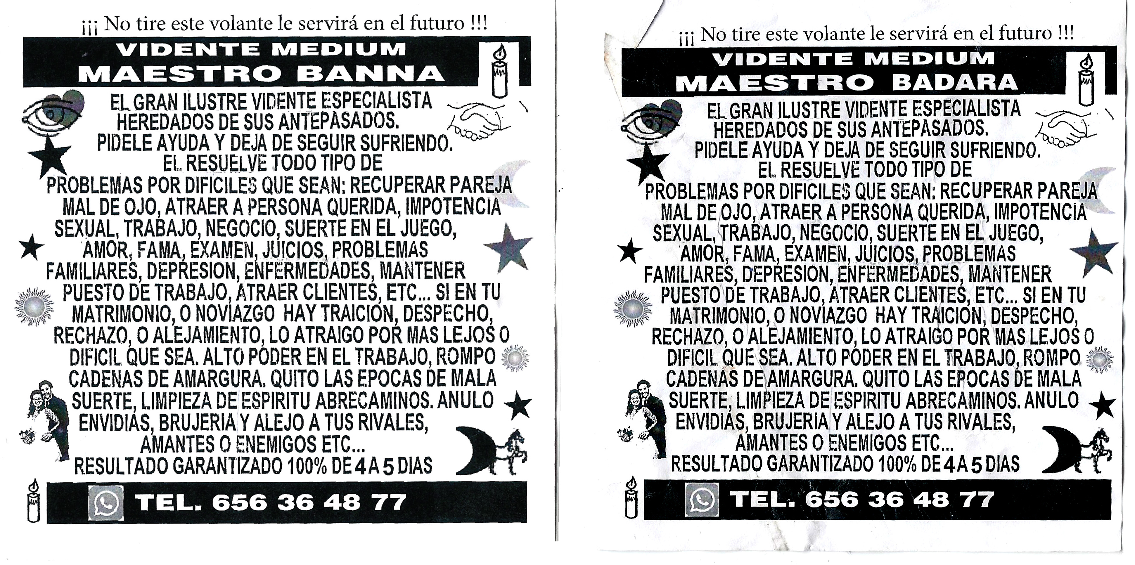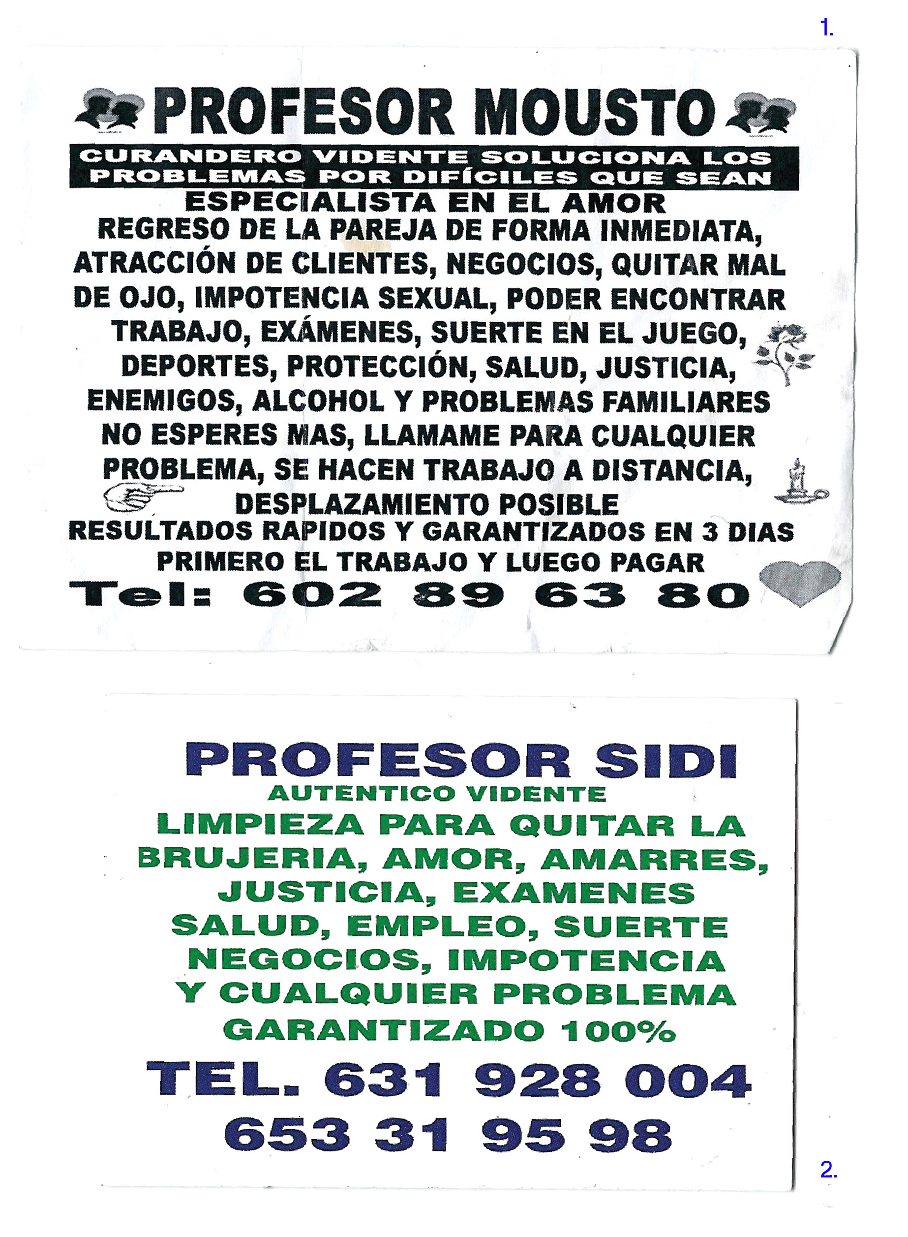 They spread their word by small sheets of paper of various sizes (usually pocket-size) in which they illustrate all that they're able to solve as well as their rank of prophet, their name and their telephone number.
