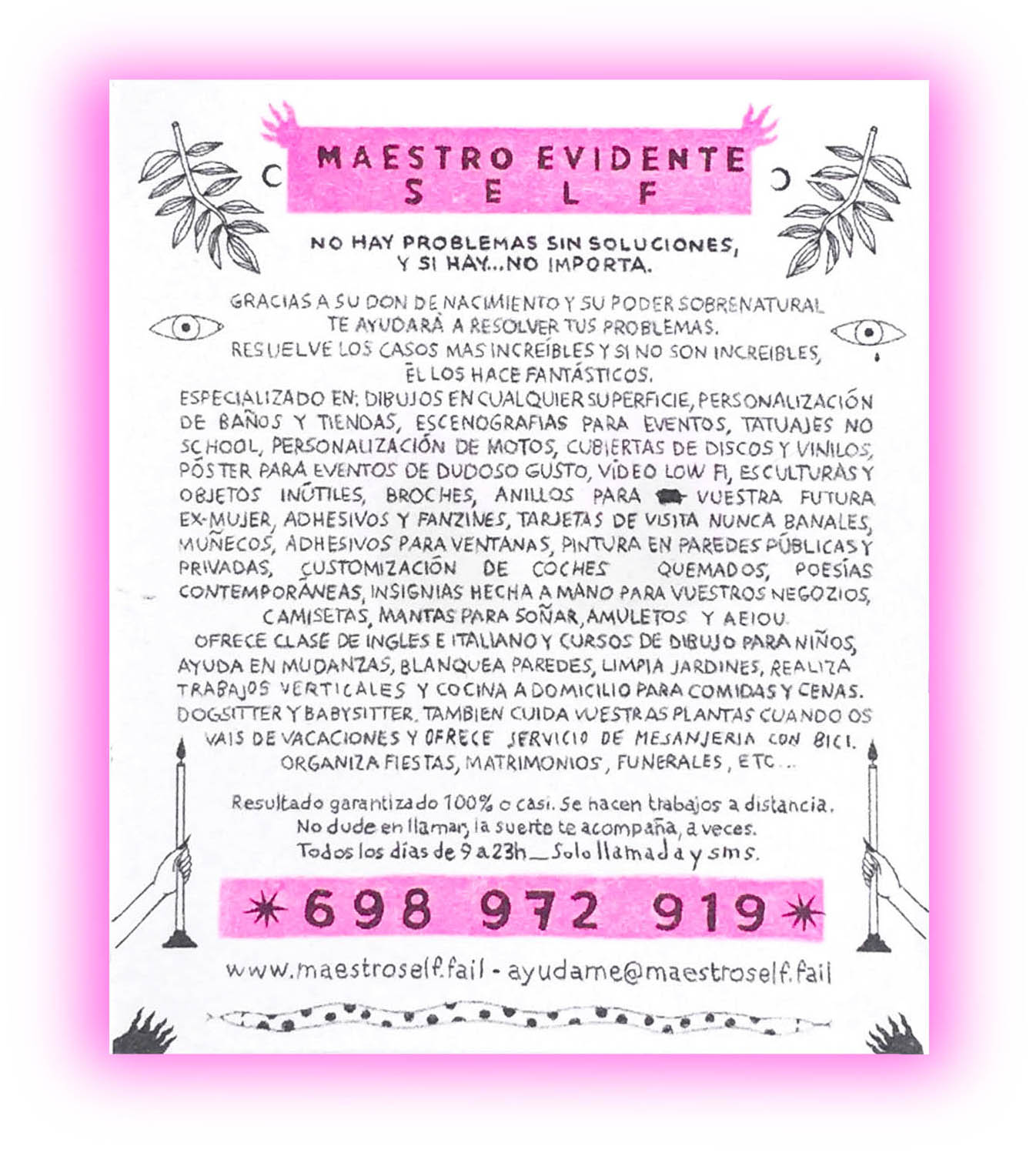 Contrary to the regular communication of the Maestros, the flyer designed for the “Maestro Evidente Self" has a backside that guarantees its recognisability no matter which side it is thrown on, which is generally the case with most flyers.