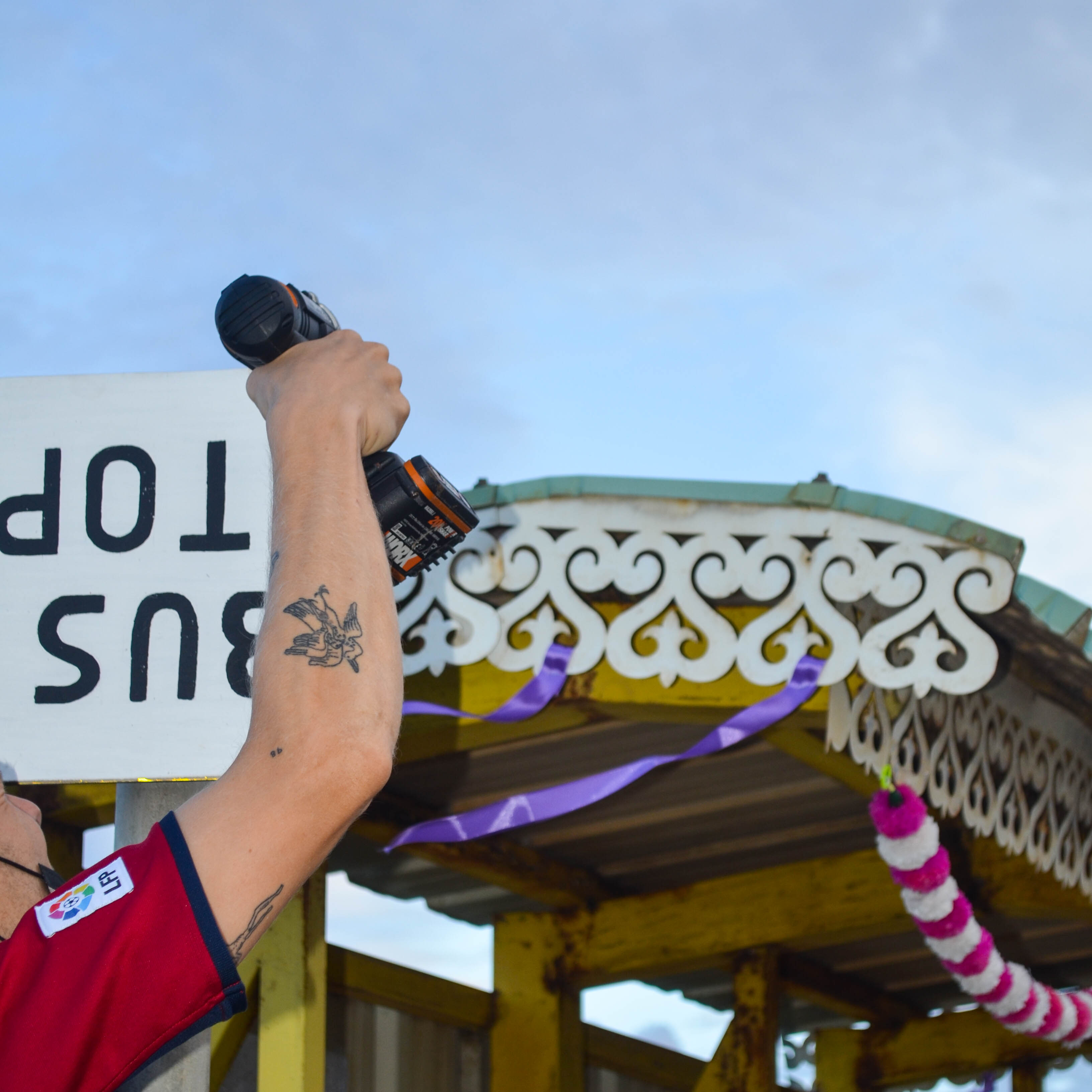 Now, that bus stop has cushions to sit on, a new sign indicating its presence and decorations that make it unique, just like the buses that stop there every day.